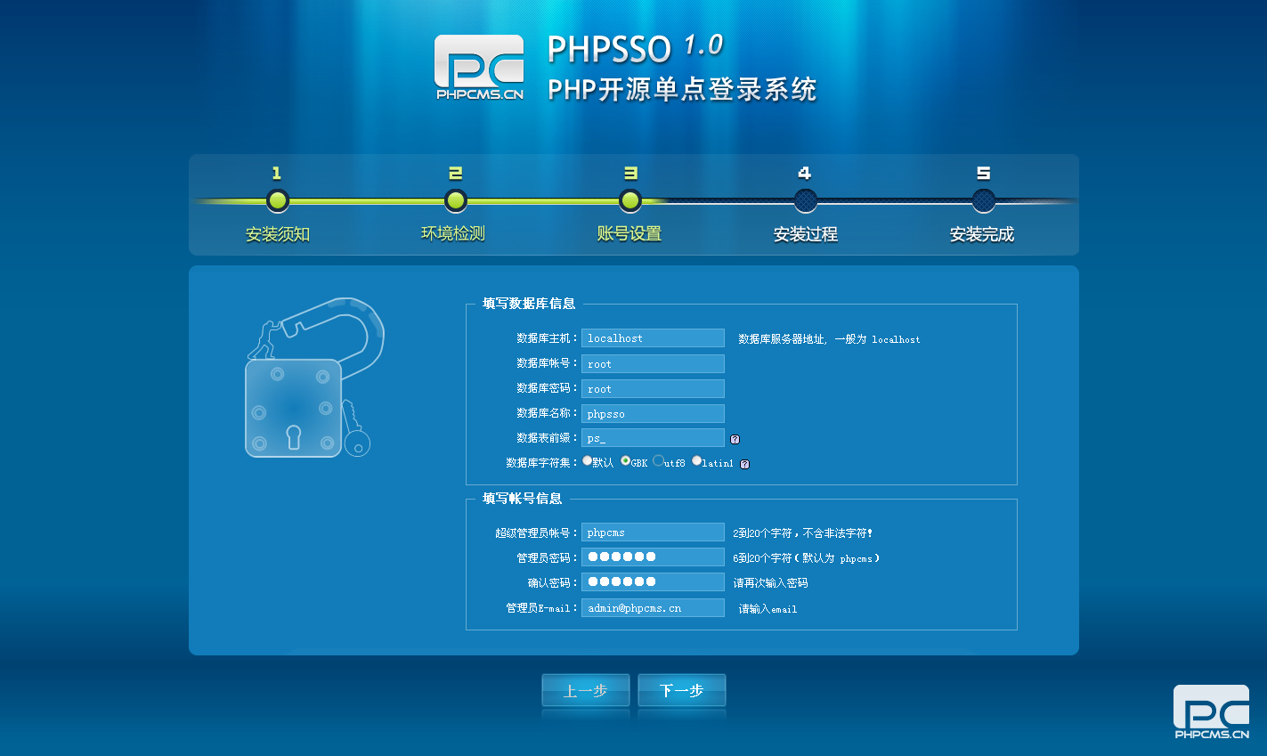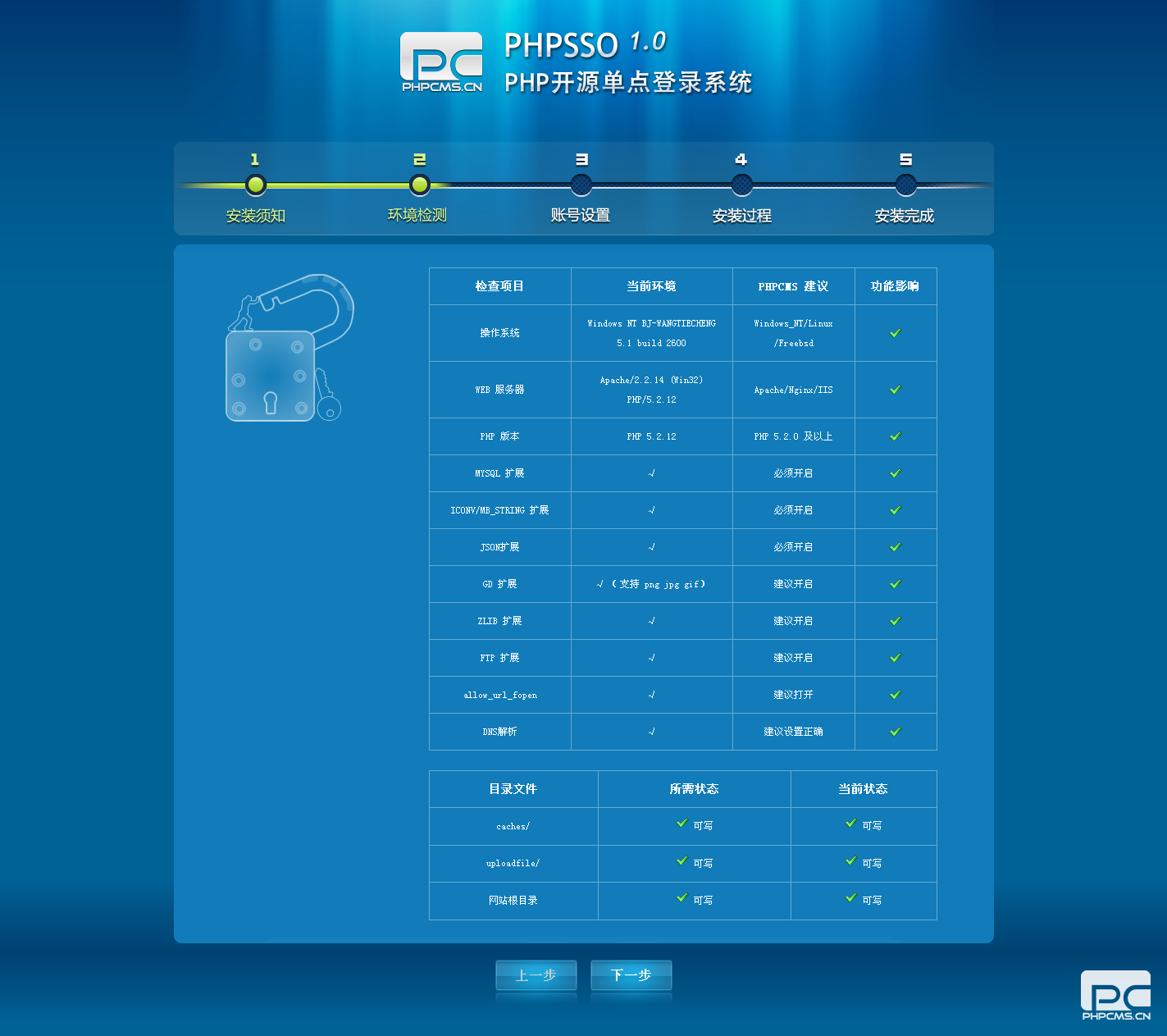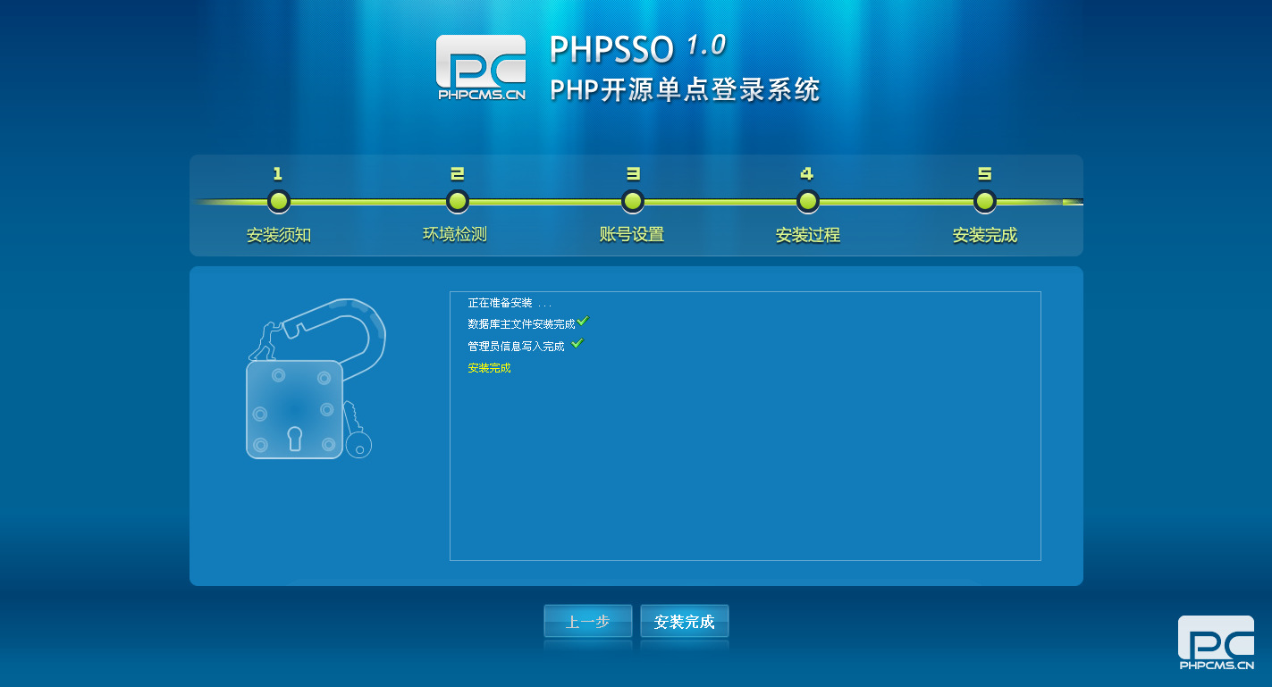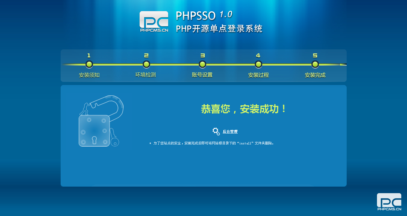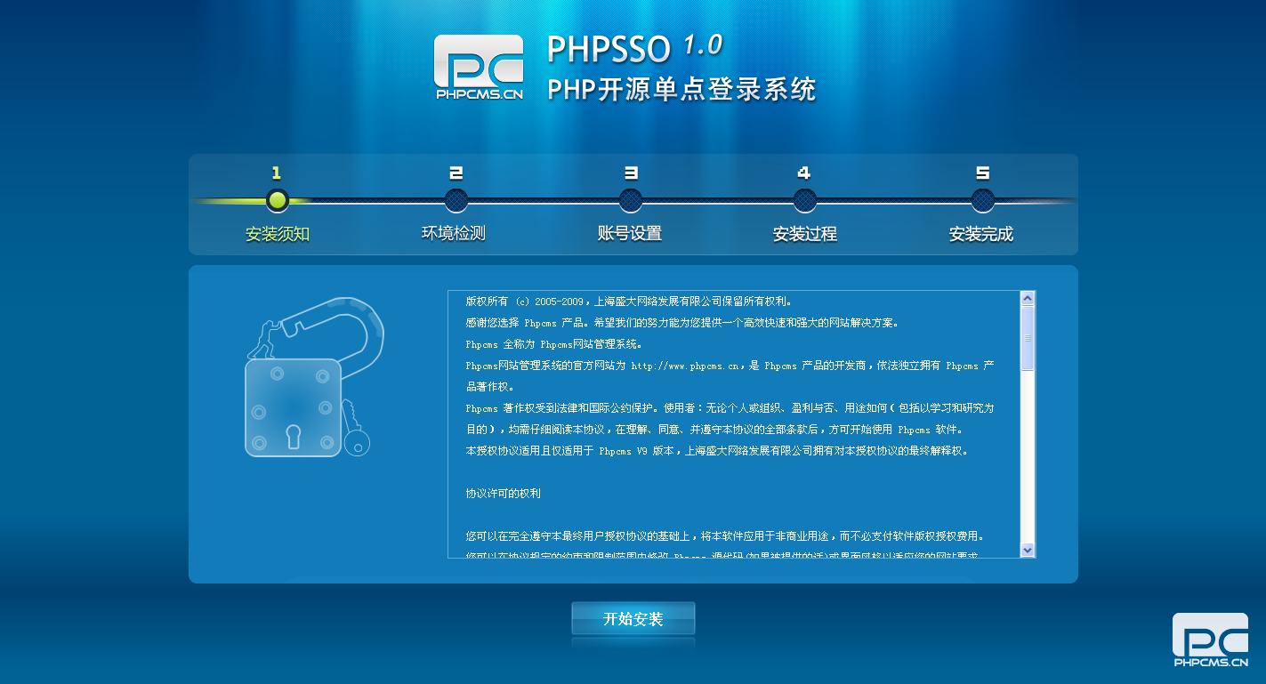 下载phpsso最新版本,解压到相应web目录,浏览器访问开始安装 下载地址:http://download.phpcms.cn 下载phpsso最新版本,解压到相应web目录,浏览器访问开始安装 下载地址:http://download.phpcms.cn/?pc_hash=sw6iVW 安装截图: 1、开始安装 2、环境检测,linux服务器注意目录可写权限 3、填写数据库、管理员信息 4、开始安装 5、完成安装